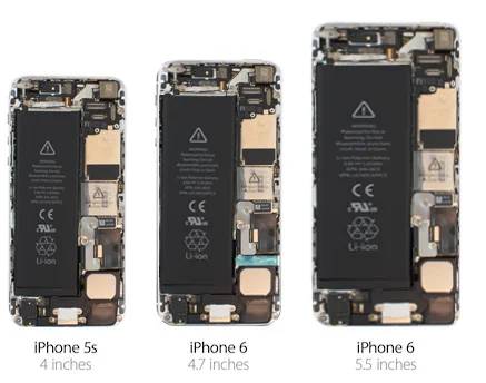 Going by the above image and design of the board and chipset, I propose that the iPhone 6 will get both increased screen size and larger batteries. I made a quick mockup below just using a iPhone 5s internals moved around to illustrate.